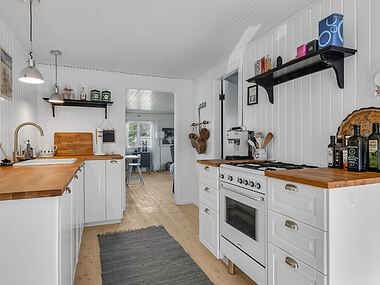 Huset rummer plads til op til 7 personer fordelt på tre hyggelige værelser og en komfortabel sovesofa. Det nyrenoverede køkken er lyst og funktionelt og åbner op mod stuen og den store overdækkede terrasse, hvor morgenkaffen nydes bedst med lyden af fuglesang og solen i ansigtet. Om aftenen forvandles terrassen til et naturligt samlingspunkt for grillhygge og lange snakke med tæpper om skuldrene.