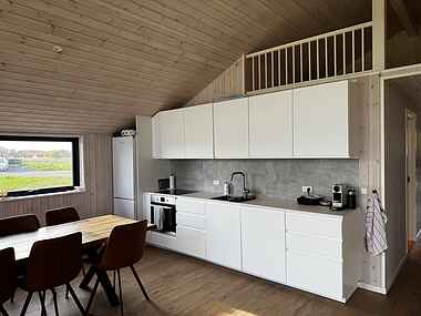Dette sommerhus fra 2024 har plads til op til ti personer og rummer fire separate soveværelser og en hems. Boligen er 112 m² og helårsisoleret, så her er behageligt hele året. Det store opholdsrum kombinerer stue, spiseplads og køkken i ét åbent og funktionelt rum.
