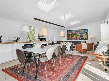 Hovedhuset rummer et stort og skønt køkkenalrum med køkkenafdeling, stue samt spiseområde, hvor der er plads til hele familien eller vennerne. Her venter jer en stor sofagruppe, fladskærmstv og brændeovn, hvor hyggen kan finde sted i aftentimerne. Hertil er der et flot spisebord parat til feriens måltider samt et lyst og funktionelt køkken. I køkkenalrummet er der ovenlysvinduer, som giver et fantastisk naturligt lysindfald med den gode loftshøjde.