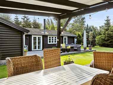 Dette charmerende bjælkehus på 95 m² er ideelt for større familier eller vennegrupper med fem soveværelser og ni sovepladser. Huset er indrettet med sans for detaljen og har en hyggelig atmosfære. Med småsprossede vinduer og en hyggelig pejs kan du opleve ægte dansk “hygge.” Udenfor byder en stor træterrasse på solsenge, overdækket siddeområde og grill. Nyd solen hele dagen, fra morgenkaffen til de sene aftentimer.