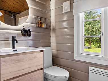 Indendørs findes en rummelig stue med brændeovn og internetforbindelse. Køkkenet er veludstyret, og med husets varmepumpe er det nemt at holde behagelig temperatur året rundt.
