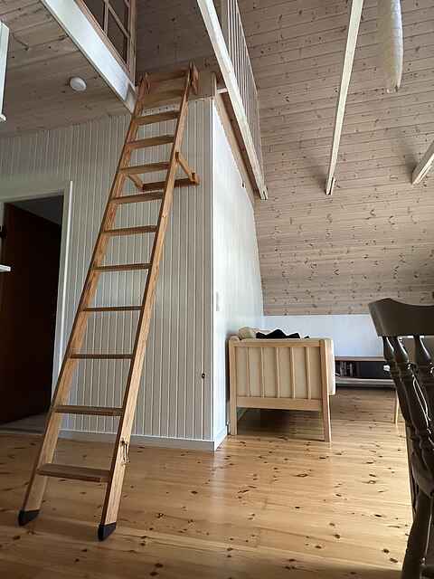 Der er et soveværelse med dobbeltseng og et mindre værelse med en enkelt seng. På den høje hems er to senge, og hemsen er åben mod stuen, hvor der er loft til kip. For at komme op på hemsen benyttes en robust fastmonteret stige.