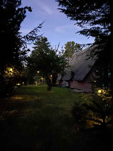Charmerende sommerhus med stråtag muret i klassiske røde mursten, med dejligt lysindfald og en højloftet hems.