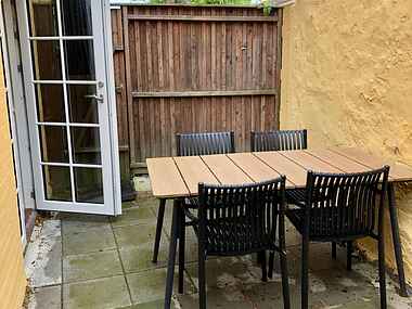 I stueetagen ligger et fuldt udstyret køkken, badeværelse samt en lys og indbydende opholds- og spisestue. Fra stuen er der adgang til en privat, lukket gårdhave med havemøbler og grill.