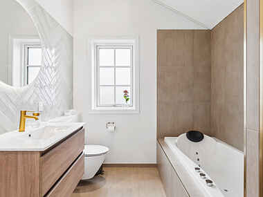 Huset har to stilfulde badeværelser med bruser og toilet, og som en ekstra luksus kan du forkæle dig selv i et 1-personers spa med massagedyser.