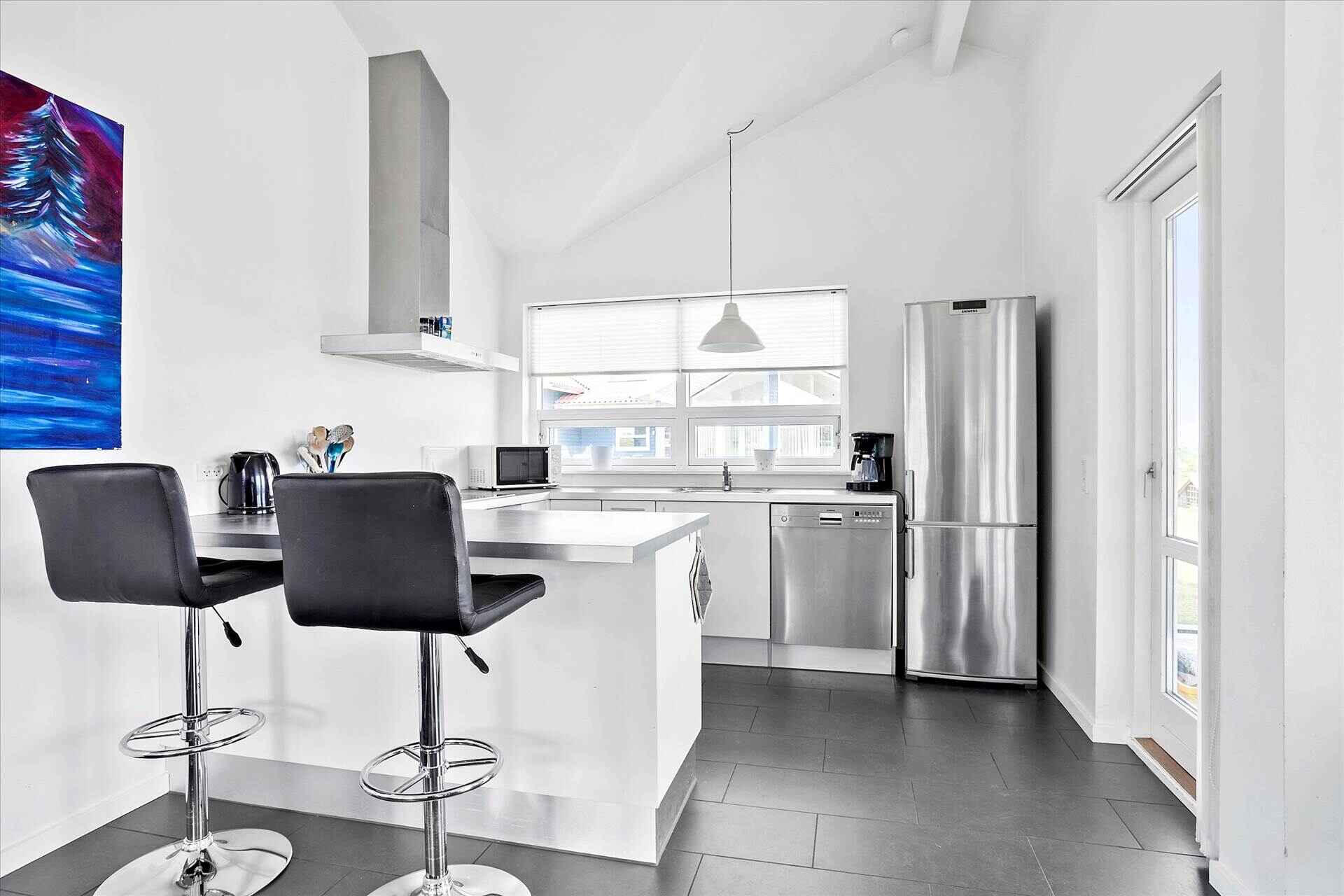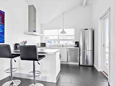 Indendørs finder I to badeværelser med gulvvarme, spa og sauna, et åbent køkken med moderne faciliteter og en hyggelig opholdsstue med brændeovn. TV med danske og tyske kanaler samt gratis Wi-Fi sikrer underholdning og komfort.