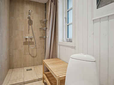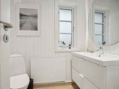 Holdt i lyse, nordiske toner med gulvvarme og en rummelig brusekabine – det perfekte sted at starte eller slutte dagen.