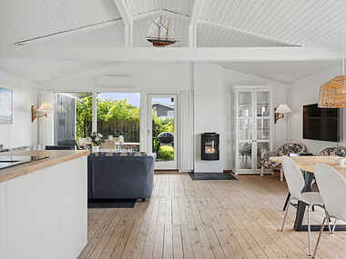 I sommerhusets lyse og indbydende spisestue kan I slappe af og nyde måltiderne med en imponerende udsigt over havet. Denne smukke havudsigt kan også nydes fra husets dejlige træterrasse, som er perfekt til afslappende dage i solen eller hyggelige aftener med grillmad.