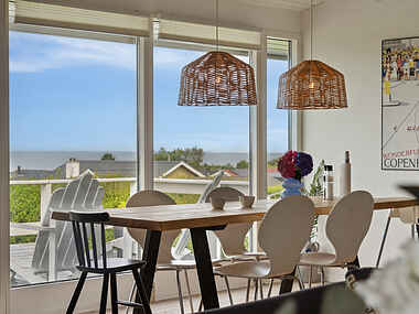 I sommerhusets lyse og indbydende spisestue kan I slappe af og nyde måltiderne med en imponerende udsigt over havet. Denne smukke havudsigt kan også nydes fra husets dejlige træterrasse, som er perfekt til afslappende dage i solen eller hyggelige aftener med grillmad.