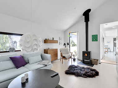 I stuen kan I synke ned i en komfortabel sofa og lade jer fortrylle af knitrende flammer i brændeovnen, mens I nyder jeres yndlingsprogram på den fladskærms-TV. Stuen inviterer til afslapning, familiehygge og vidunderlige øjeblikke. Huset byder desuden på tre rummelige soveværelser, hvoraf tre er udstyret med dobbeltsenge og det sidste med en hyggelig køjeseng. Dette fortryllende sommerhus har plads til op til seks gæster.