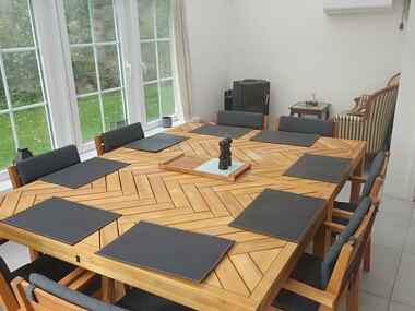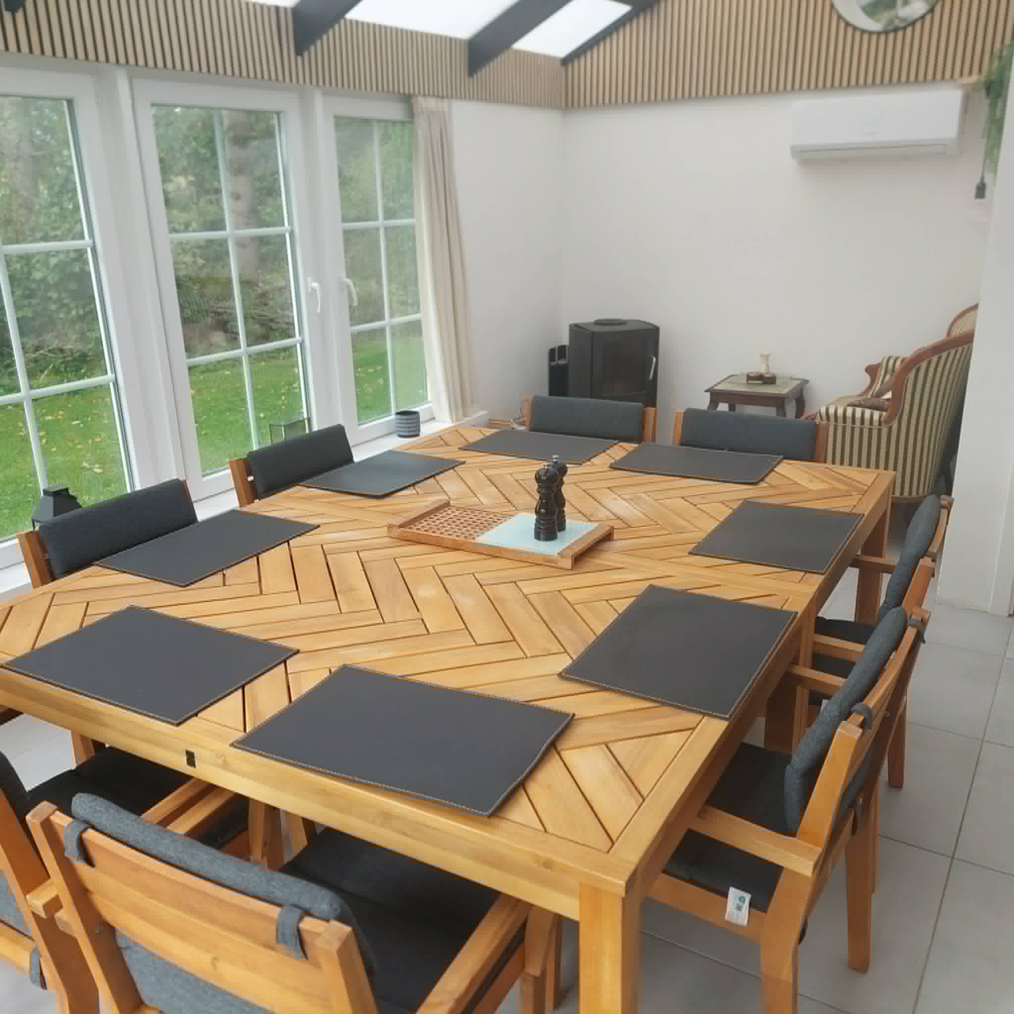Den hyggelige udestue med brændeovn giver et skønt rum til afslapning. Her kan I nyde udsigten til haven, uanset vejr, og lade roen sænke sig.