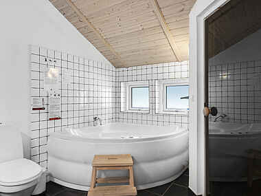Med en omhyggelig indretning byder huset på en komfortabel oase. Du vil finde ikke mindre end 4 smagfulde soveværelser (et af dem med køjeseng), og i badeværelset kan du forkæle dig selv med afslapning i spaen eller i saunaen. Et gæstetoilet, et veludstyret køkken og en rummelig opholdsstue tilbyder alt, hvad du behøver for en behagelig ferie. Køkken og badeværelser har behagelig gulvvarme, og en smart varmepumpe sikrer, at du altid har det helt rette klima.