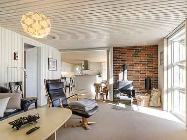 I forlængelse af køkken/alrum forefindes en hyggelig stue med brændeovn. Stuen er indrettet med hjørnesofa og lænestole.