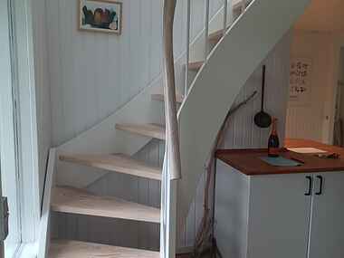 Lyst velindrettet køkken med opvaskemaskine, ligger i delvis åben forbindelse med både stue samt alrum med spise/krea/kontorplads og hyggelig alkove indrettet med soveplads. Stuen er indrettet med stor spiseplads, hyggeligt sofahjørne, brændeovn og varmepumpe. Fra stuen trappe til 1. sal og husets 3 soverum. Et stort soveværelse med dobbeltseng og stor garderobe med opbevaringsplads, samt 2 værelser – det ene med dobbeltseng og det andet med udtræksseng til 2 sovepladser.
