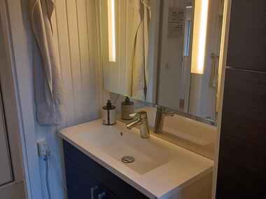 Huset: indgang via mindre entre/bryggers med vaskemaskine og skabsfryser. Herfra videre til mindre gang, hvor der er adgang til godt badeværelse med bruser, samt god opbevaringsplads.