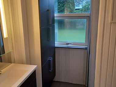 Huset: indgang via mindre entre/bryggers med vaskemaskine og skabsfryser. Herfra videre til mindre gang, hvor der er adgang til godt badeværelse med bruser, samt god opbevaringsplads.