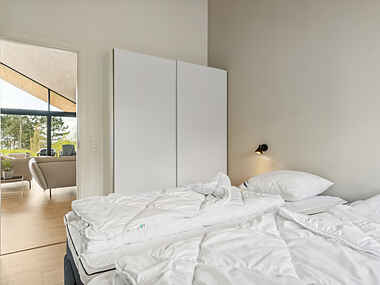 Med sine 134 m2 er der rigelig plads til alle, uanset om I ønsker at samles til hyggelige måltider i det åbne køkken-alrum eller slappe af i den behagelige stue med panoramaudsigt over den omkringliggende natur. De to komfortable elevationssenge sikrer en god nattesøvn, og de store vinduer lader det naturlige lys strømme ind og giver jer en forfriskende følelse af nærhed til naturen.