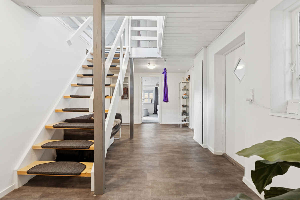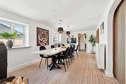 Køkkenet er veludstyret til fælles madlavning, og den åbne forbindelse til spiseplads og stue gør det nemt at være sammen. Hele huset er praktisk indrettet med fokus på funktionalitet og gode rammer for samvær.