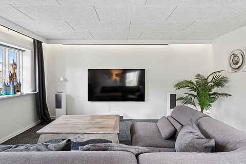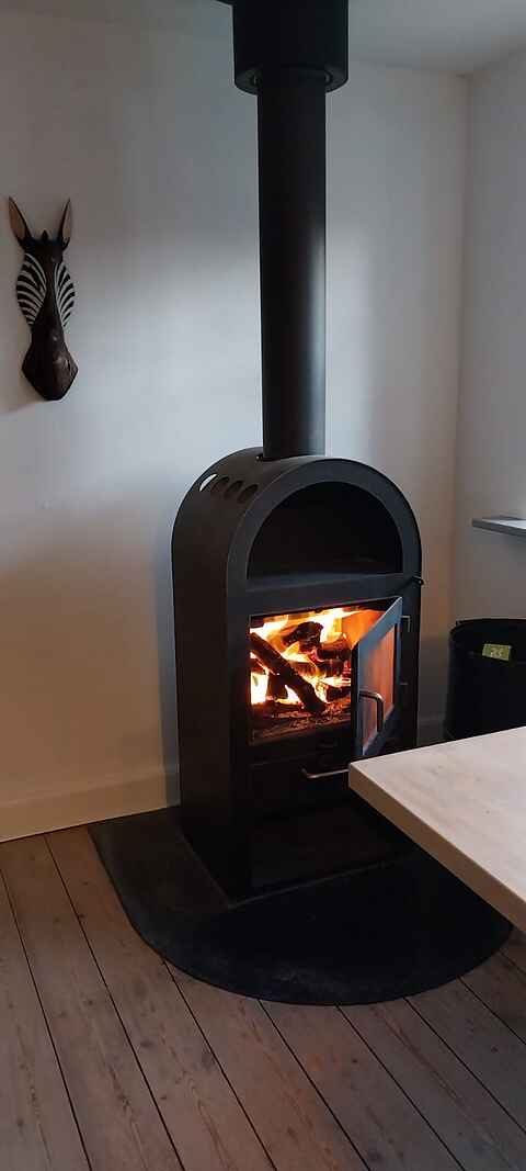 Stuen er indrettet til samvær og hygge. Her finder du et smart-tv samt et stort biograflærred til film og spil samt en brændeovn, der kan tændes på kølige aftener. Internet er tilgængeligt i hele huset, så du kan være online, når det ønskes.