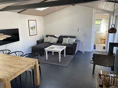 Indenfor byder huset på alt, hvad man behøver for en enkel og bekvem ferie. Opholdsrum og køkken ligger i åben forbindelse, og der er udgang til terrasse og have fra stuen. Her er både plads til fælles måltider og stille stunder.