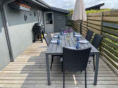 Udenfor findes en skøn, overskuelig have med god plads til leg og afslapning. Terrassen indbyder til grill og aftenhygge, mens havets brusen i baggrunden skaber den rette feriestemning.