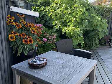 I husets have finder I en solrig træterrasse. Husets have er helt lukket og velegnet til den lille familie med mindre børn og en lille hund, eller til en romantisk ferie for to.