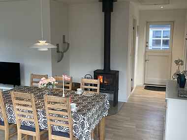 Store vinduer giver et godt lysindfald og udsigt til de rolige omgivelser. Stuen indbyder til afslapning efter en dag ved vandet eller en tur i det naturskønne område.