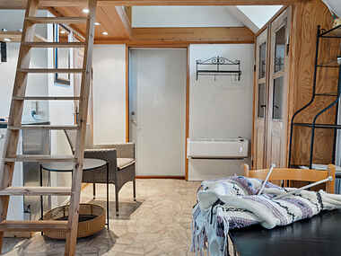 Stuen byder på 2 senge, som bruges som sofa. Over badeværelse er der en hemst med dobbeltseng.
