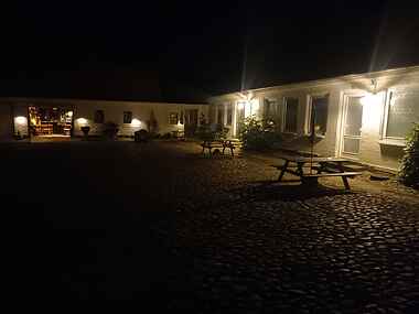 Den tidligere garage er blevet omdannet til et hyggeligt rum med borde og stole hvor der kan ryges i tørvejr.