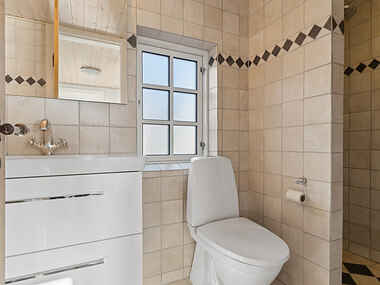 Der findes to toiletter i huset, hvoraf det ene er med bad. Bryggerset er udstyret med både vaskemaskine og tørretumbler.
