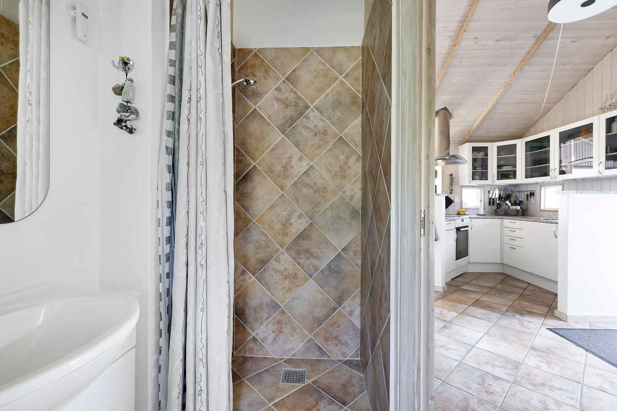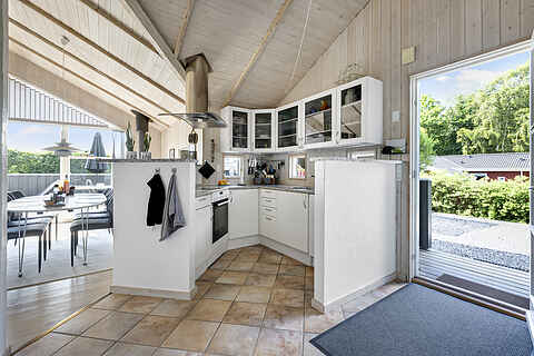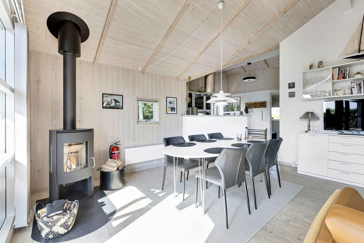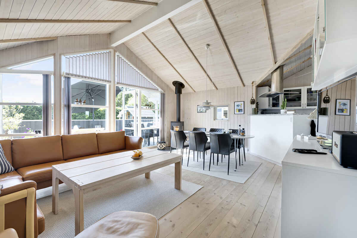 Køkkenet er fuldt udstyret, og med gulvvarme i både køkken og badeværelser, føles det altid som hjemme. Stuen er også udstyret med brændeovn og varmepumpe for optimal komfort.