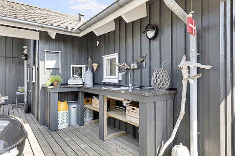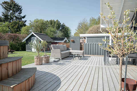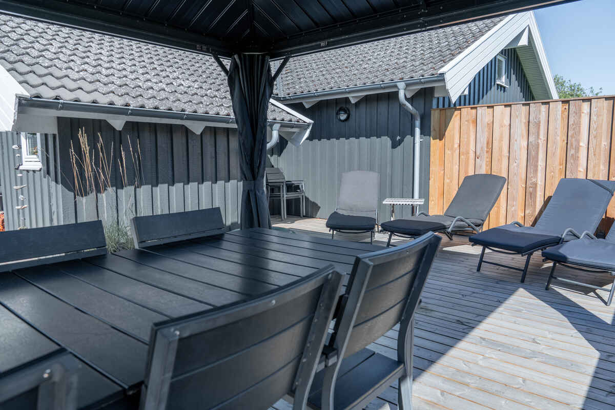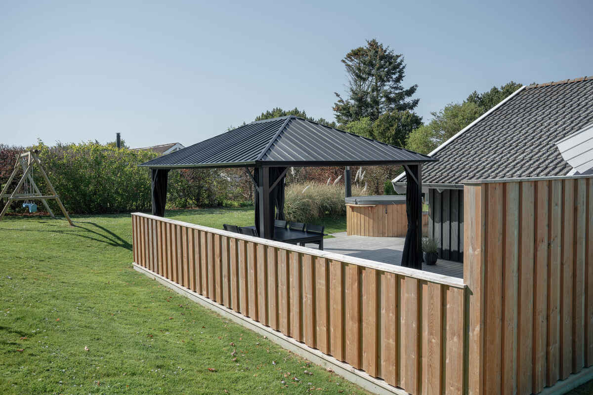 Terrassen inviterer til grill og hygge, under pavillonen med varme og LED lys.