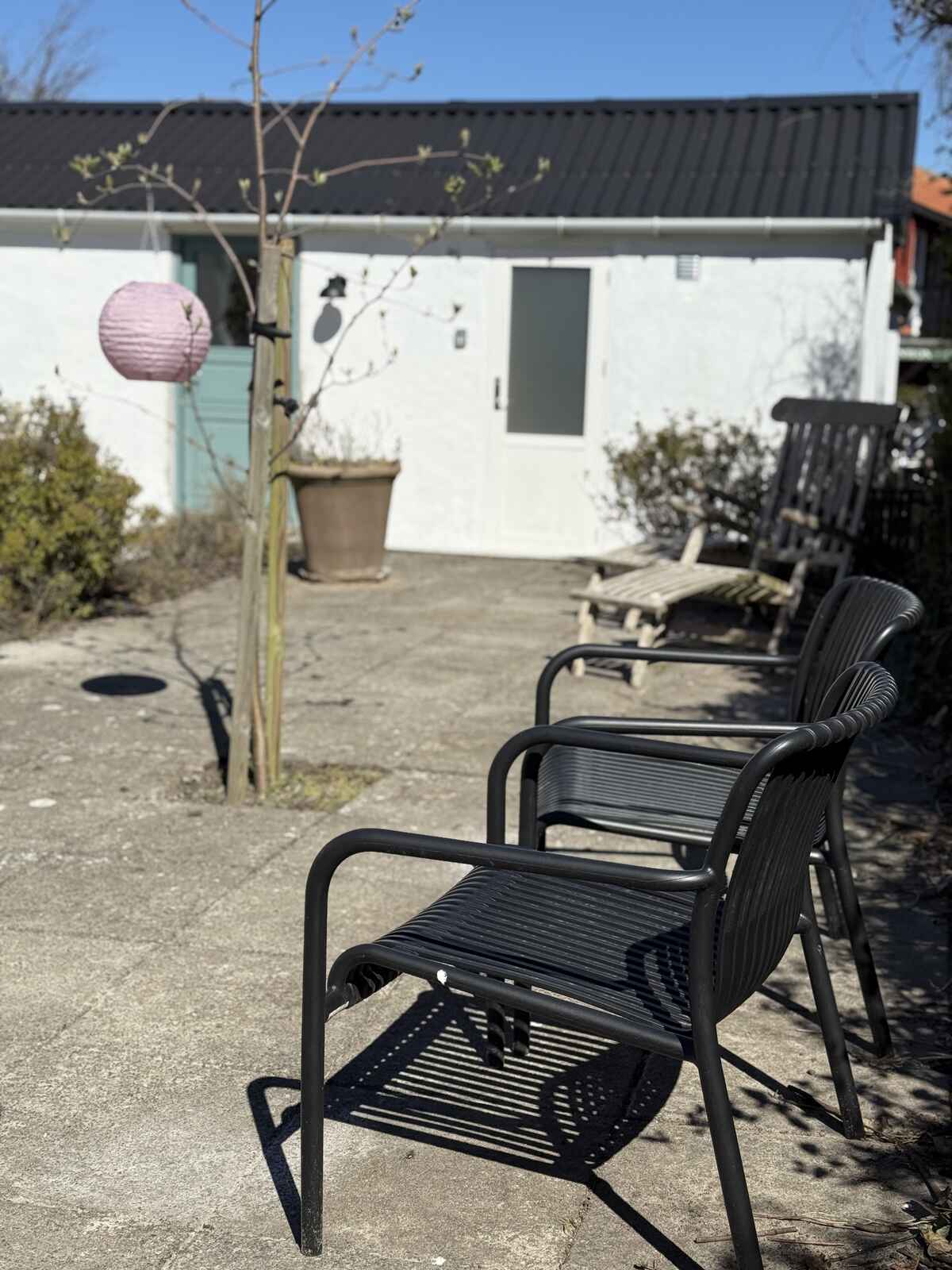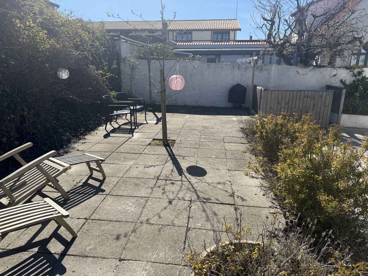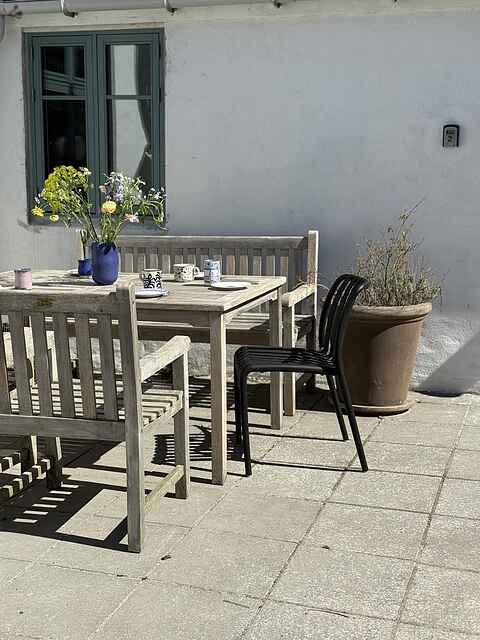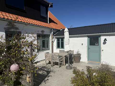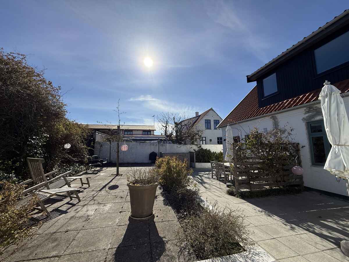 I gårdhaven har man egen solkrog med bord og stole – og resten af gården deles med en anden lejlighed. Så er man to familier afsted – på fire og fem personer – er det den perfekte kombination at leje begge lejligheder.