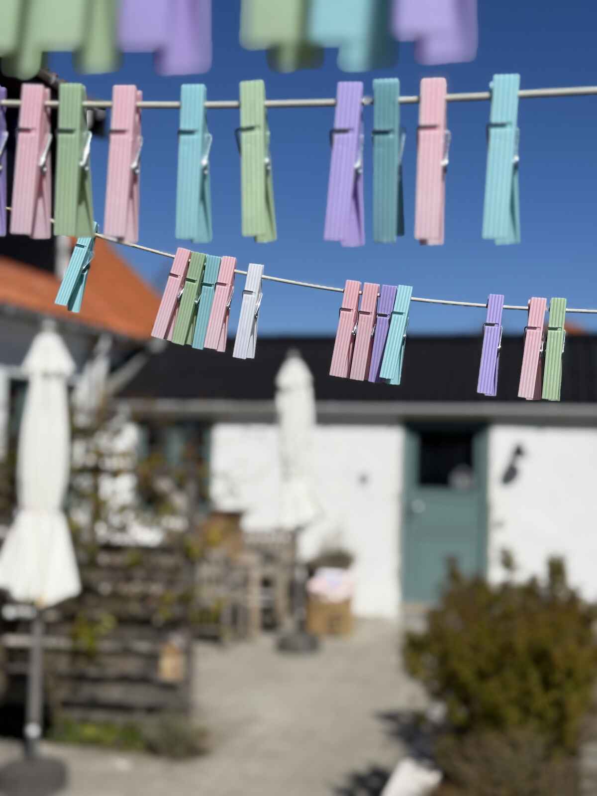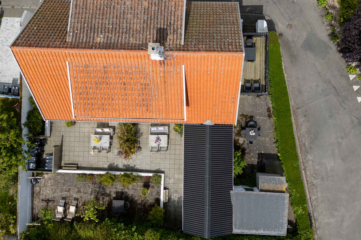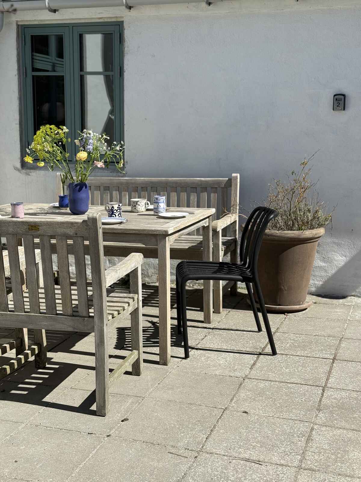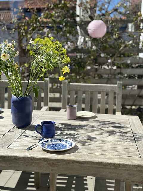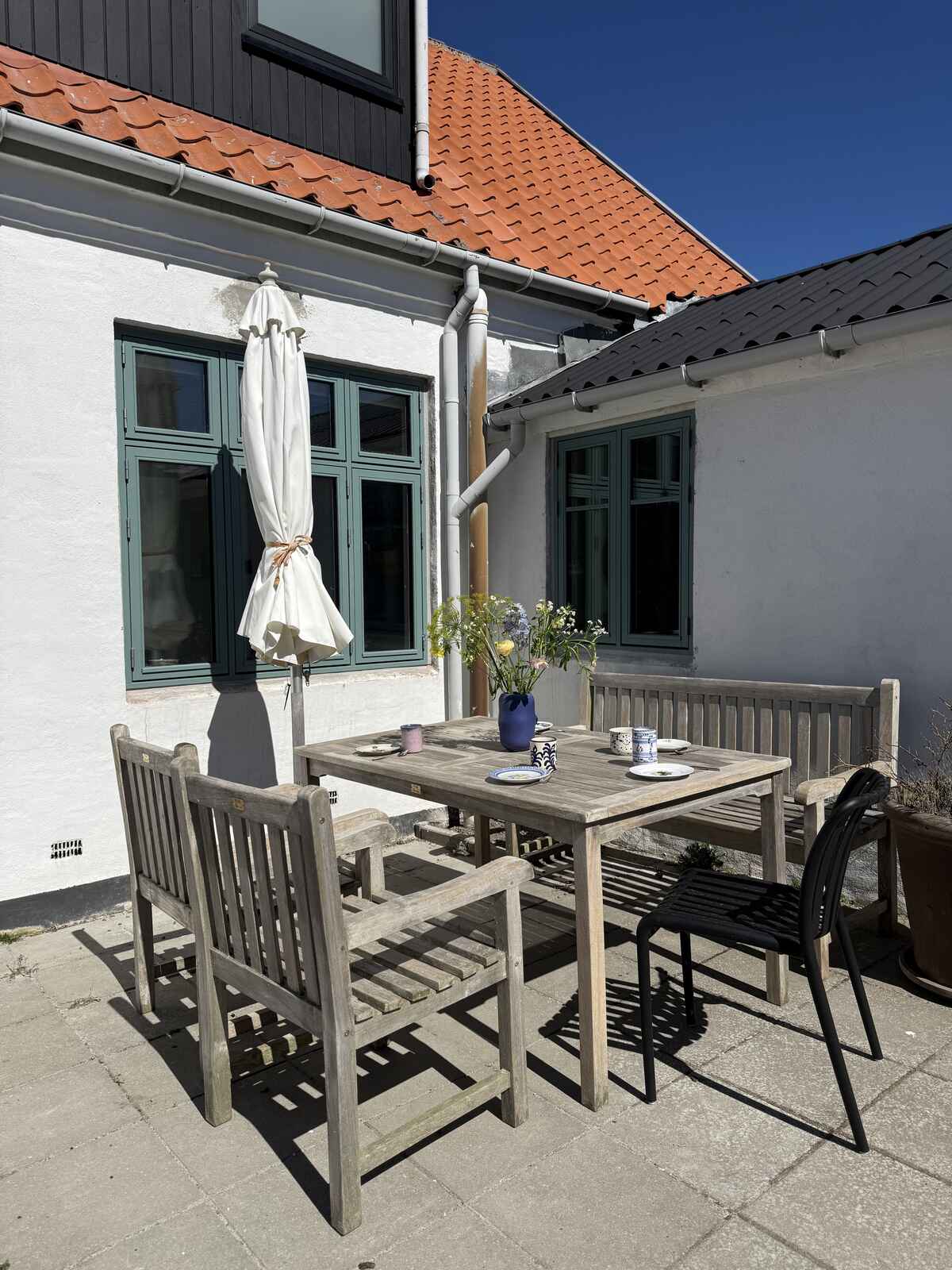 I gårdhaven har man egen solkrog med bord og stole – og resten af gården deles med en anden lejlighed. Så er man to familier afsted – på fire og fem personer – er det den perfekte kombination at leje begge lejligheder.