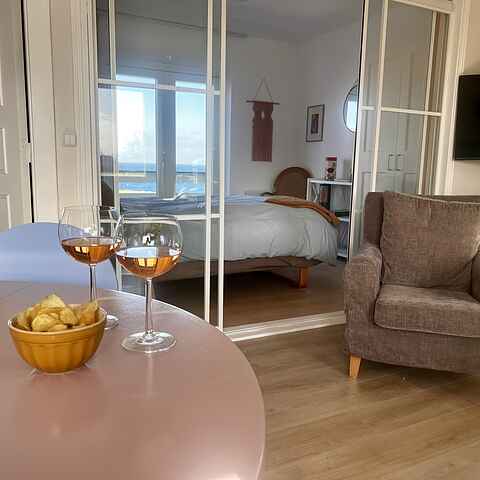 Der stilles en stor 32” computerskærm til rådighed, så du kan arbejde komfortabelt med fuld havudsigt. Her kan du kombinere hjemmearbejde og oplevelser – starte dagen med en gåtur langs klipperne, tage et online møde med udsigt over Østersøen og slutte dagen med solnedgang fra altanen.