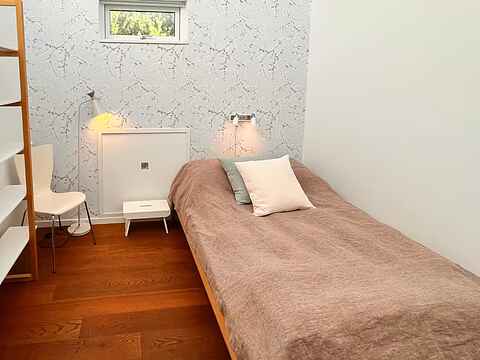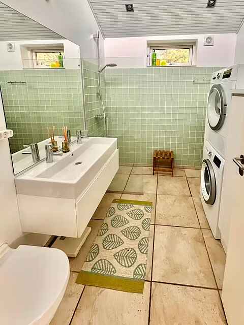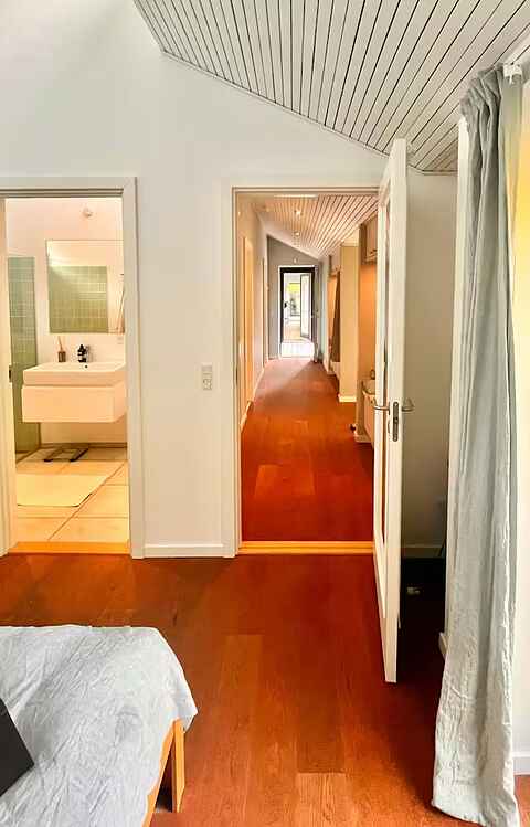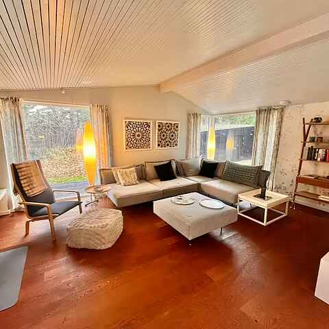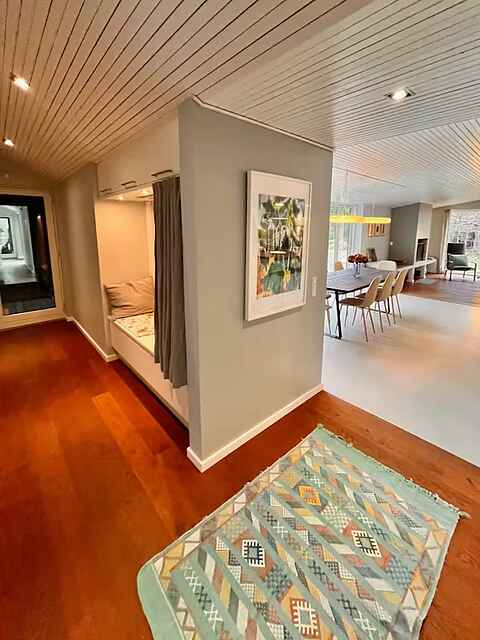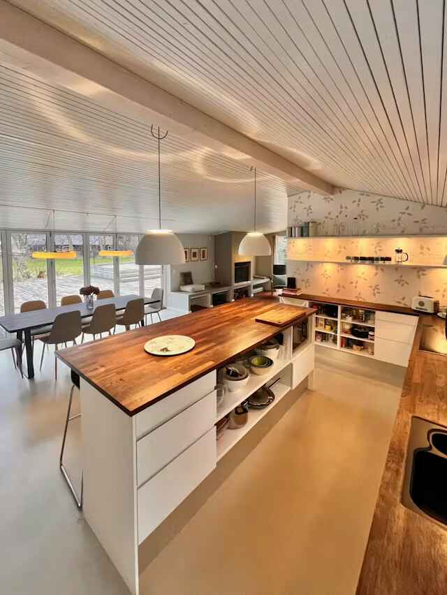 Interiøret er præget af lyse, nordiske farver med fem rummelige soveværelser, der sikrer masser af plads for både børn og voksne til at udfolde sig. De to separate boligenheder gør det muligt for børnene at lege frit i husets anneks.