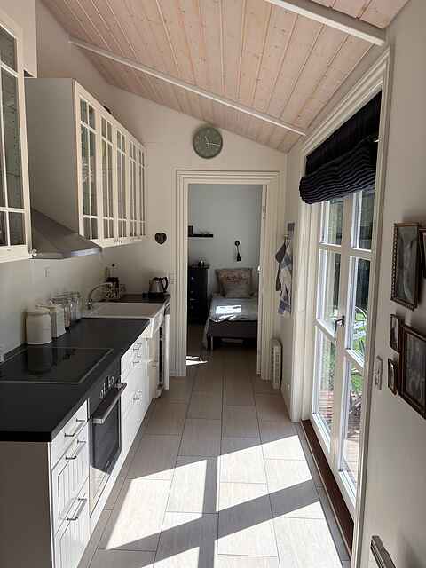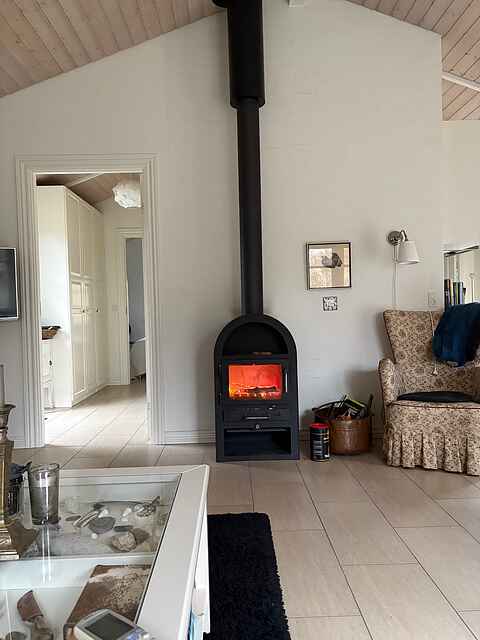 Køkkenet ligger i åben forbindelse med den dejlige, velmøblerede stue, der har brændeovn og TV med danske kanaler. Der er gratis internet og Chromecast. Huset har også varmepumpe.