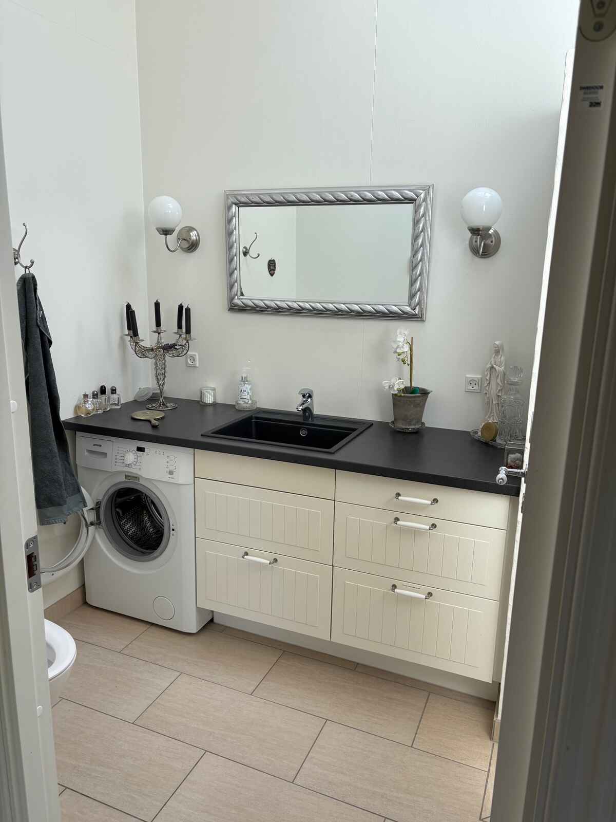 Der er et lækkert badeværelset med toilet, brusebad og varme i gulvet. Der er også vaskemaskine.