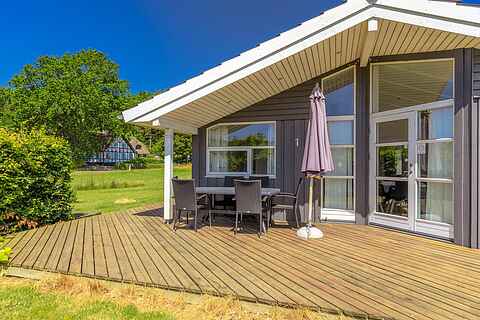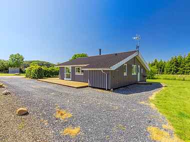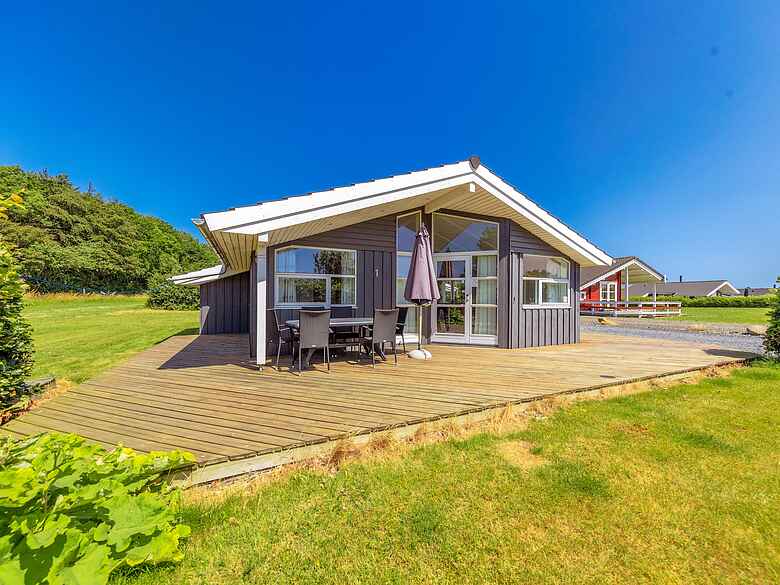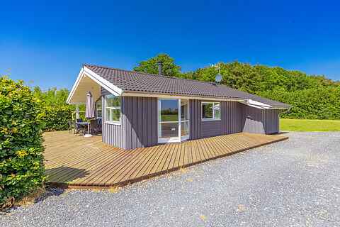 Dejligt feriehus på flot naturgrund med skøn træterrasse, og kun 300 meter til vandet. Der er både SPA og sauna. 1 kæledyr er velkommen.