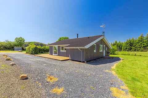 Dejligt feriehus på flot naturgrund med skøn træterrasse, og kun 300 meter til vandet. Der er både SPA og sauna. 1 kæledyr er velkommen.