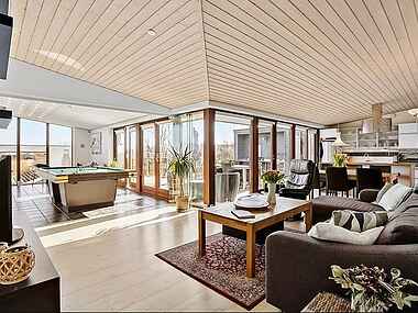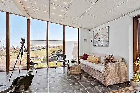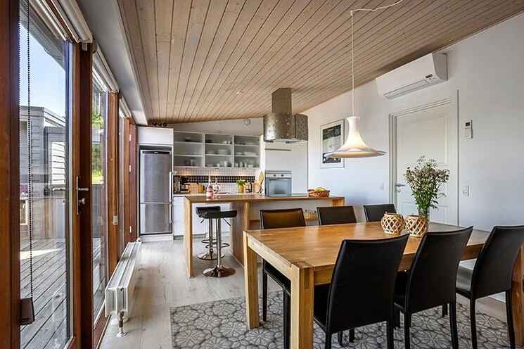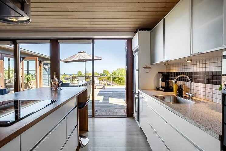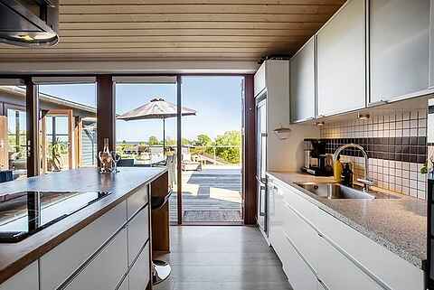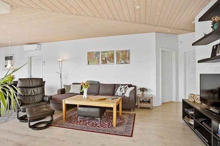 Huset er indrettet med en skøn, stor vinkelstue i forbindelse med det lækre, åbne køkken, der selvfølgelig har både opvaskemaskine og mikrobølgeovn. Der er udgang til terrassen fra køkkenet.