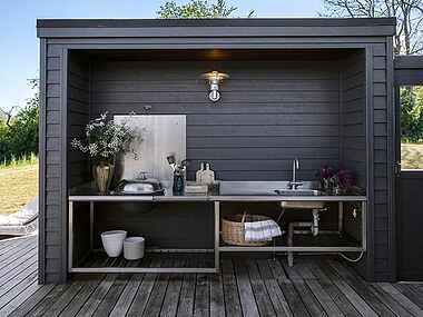 Udenfor er der en dejlig, stor, afskærmet terrasse med havemøbler og liggestole. Her er også et udekøkken, hvis I har lyst til at kaste jer ud i at tilberede maden udendørs.
