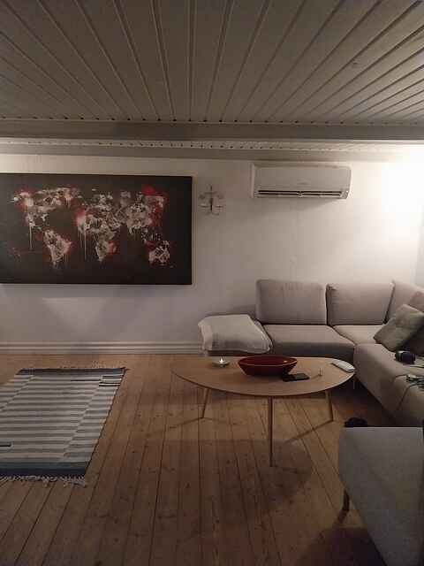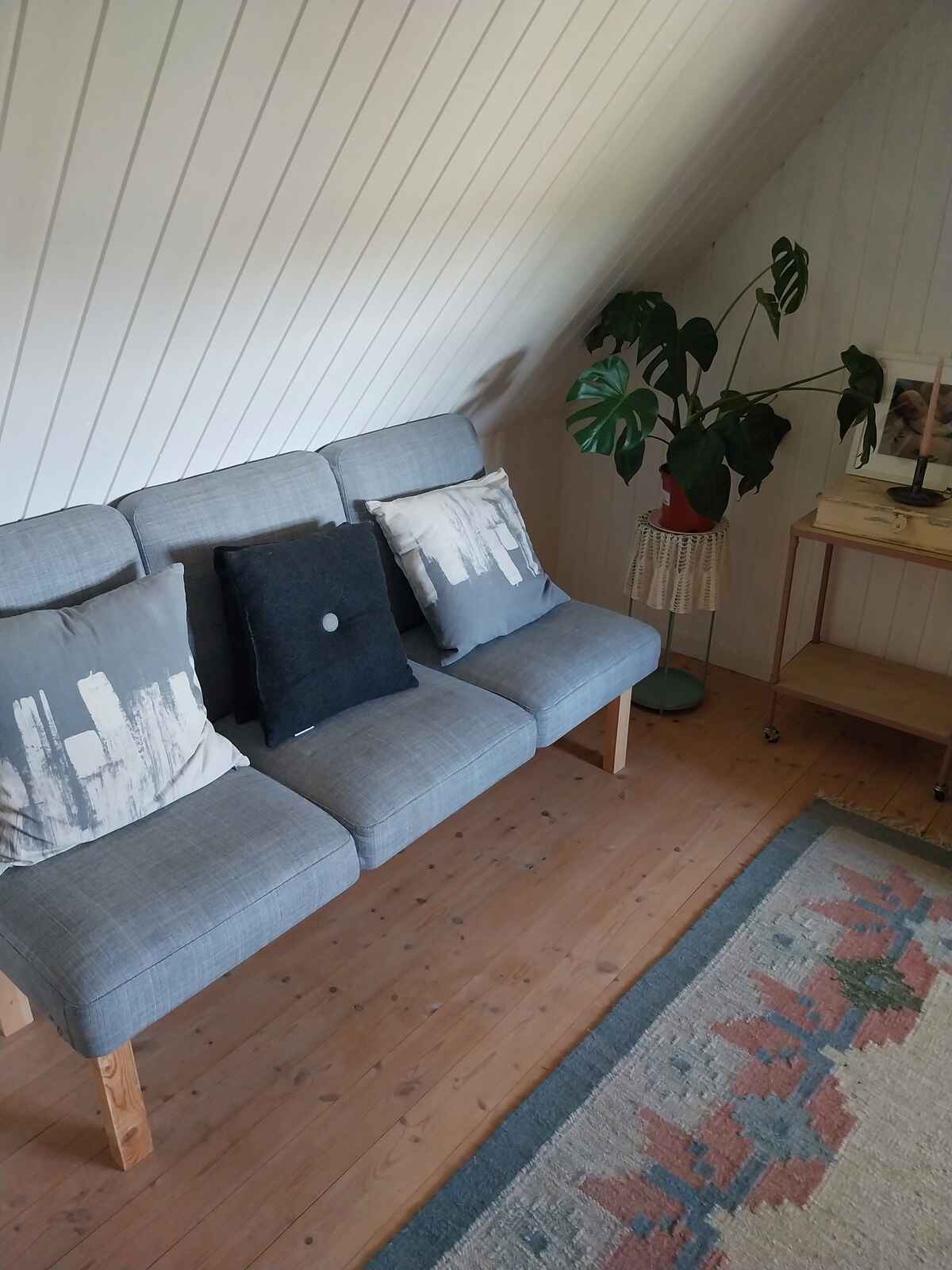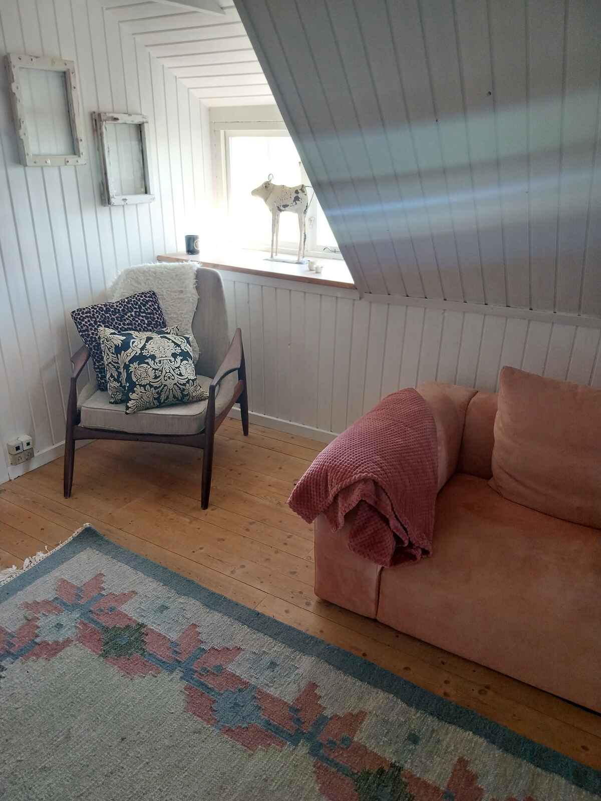 Det rummelige stueområde inviterer til afslapning med sin atmosfæriske indretning og den imponerende flydersofa. Her kan du nyde kvalitetstid med nære og kære efter en dag fyldt med udflugter.