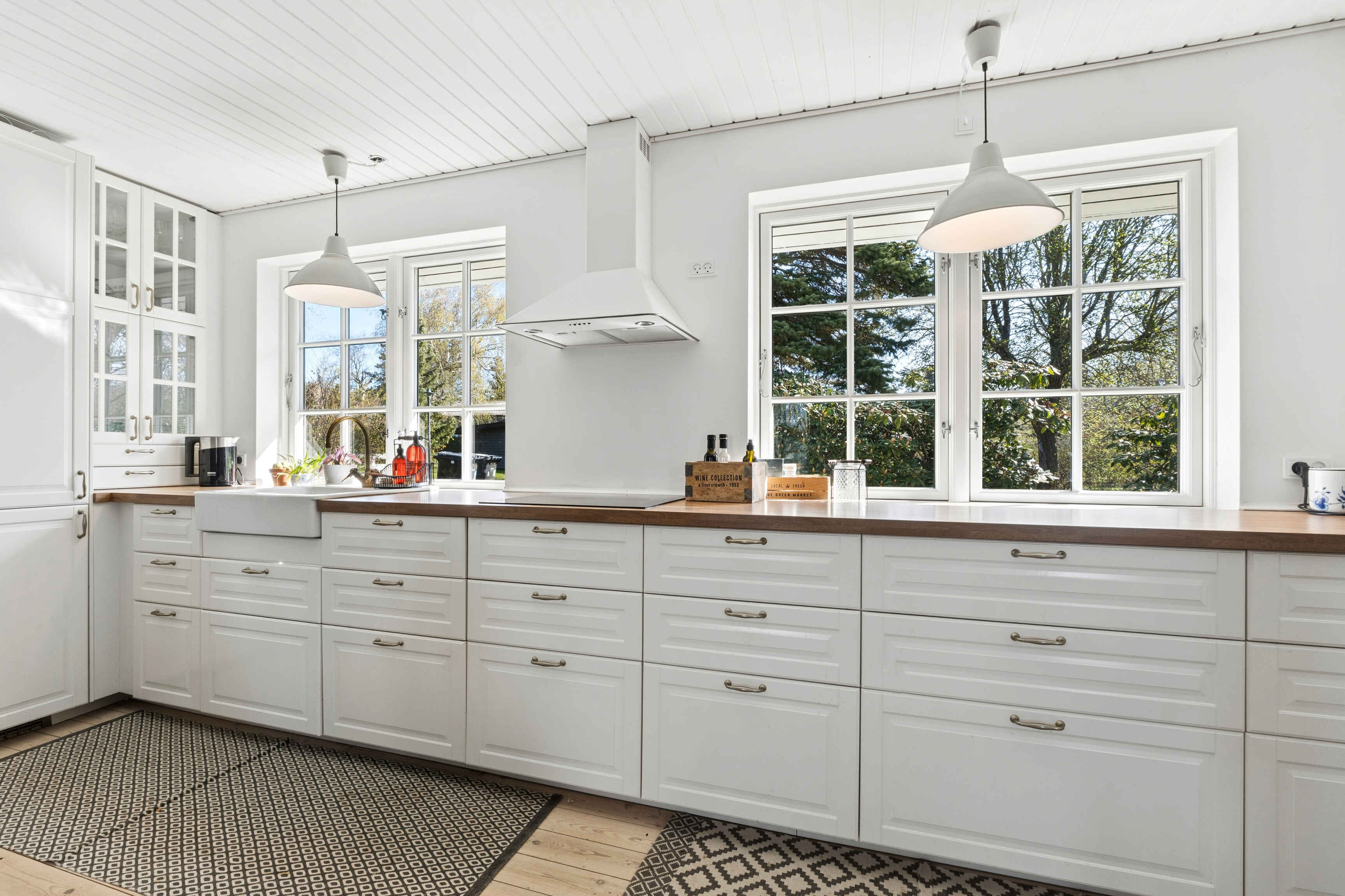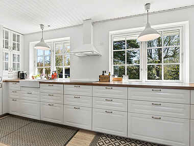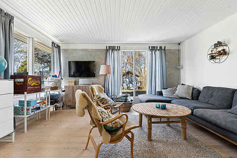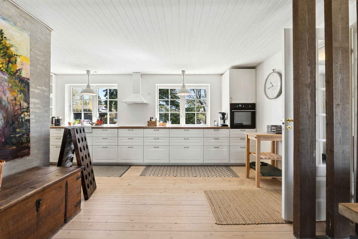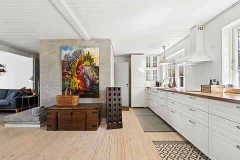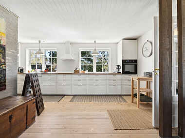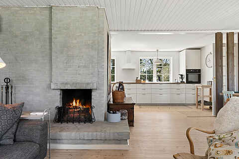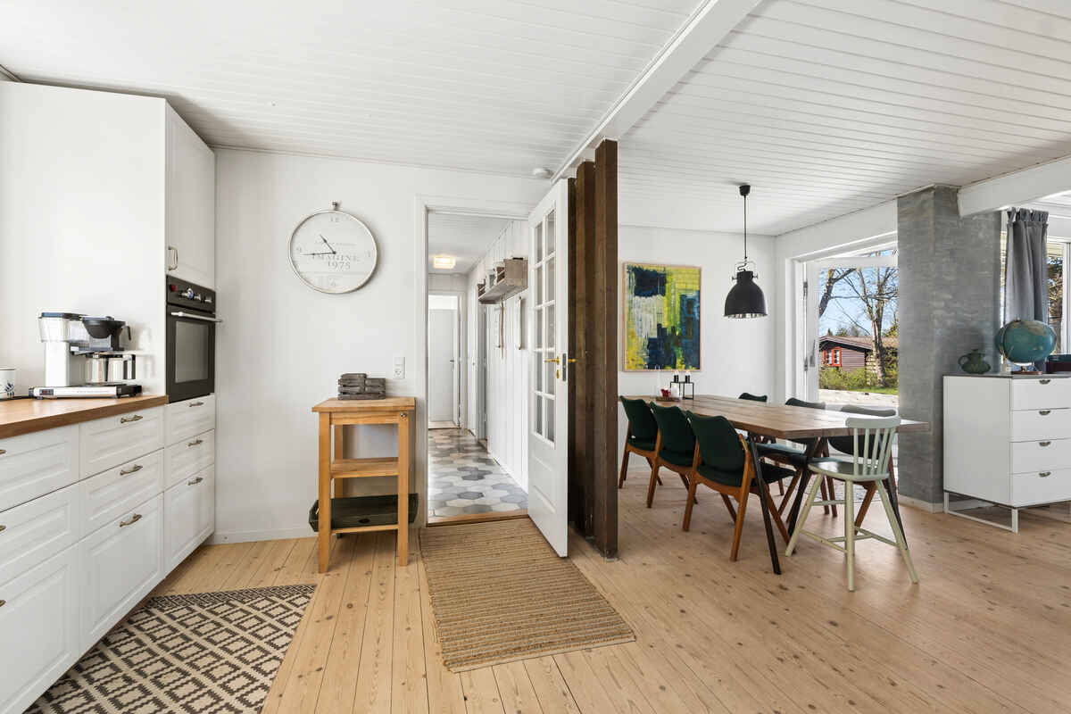 De lyse opholdsrum og det store køkken skaber en naturlig ramme for hyggelige måltider og samvær. Her er plads til at slappe af og nyde ferien i rolige omgivelser.