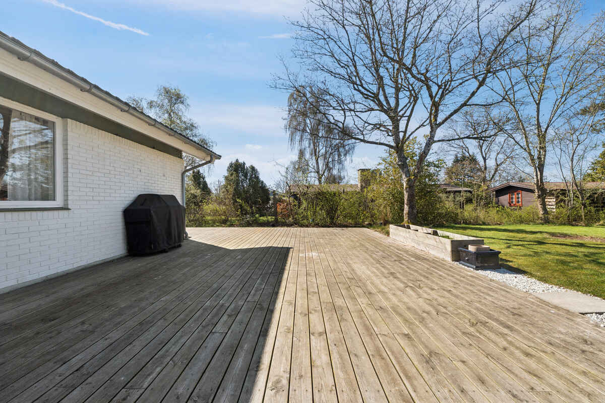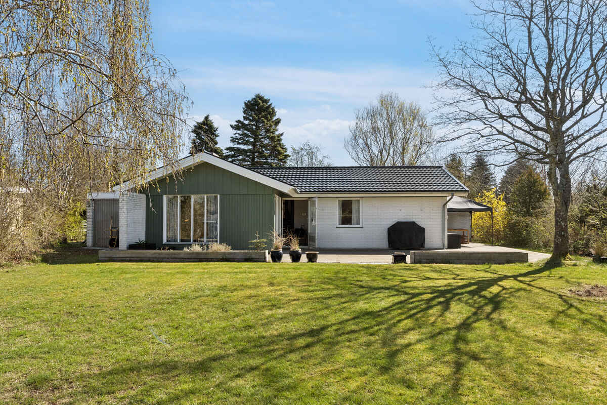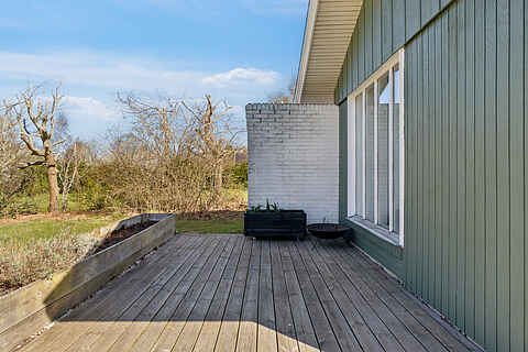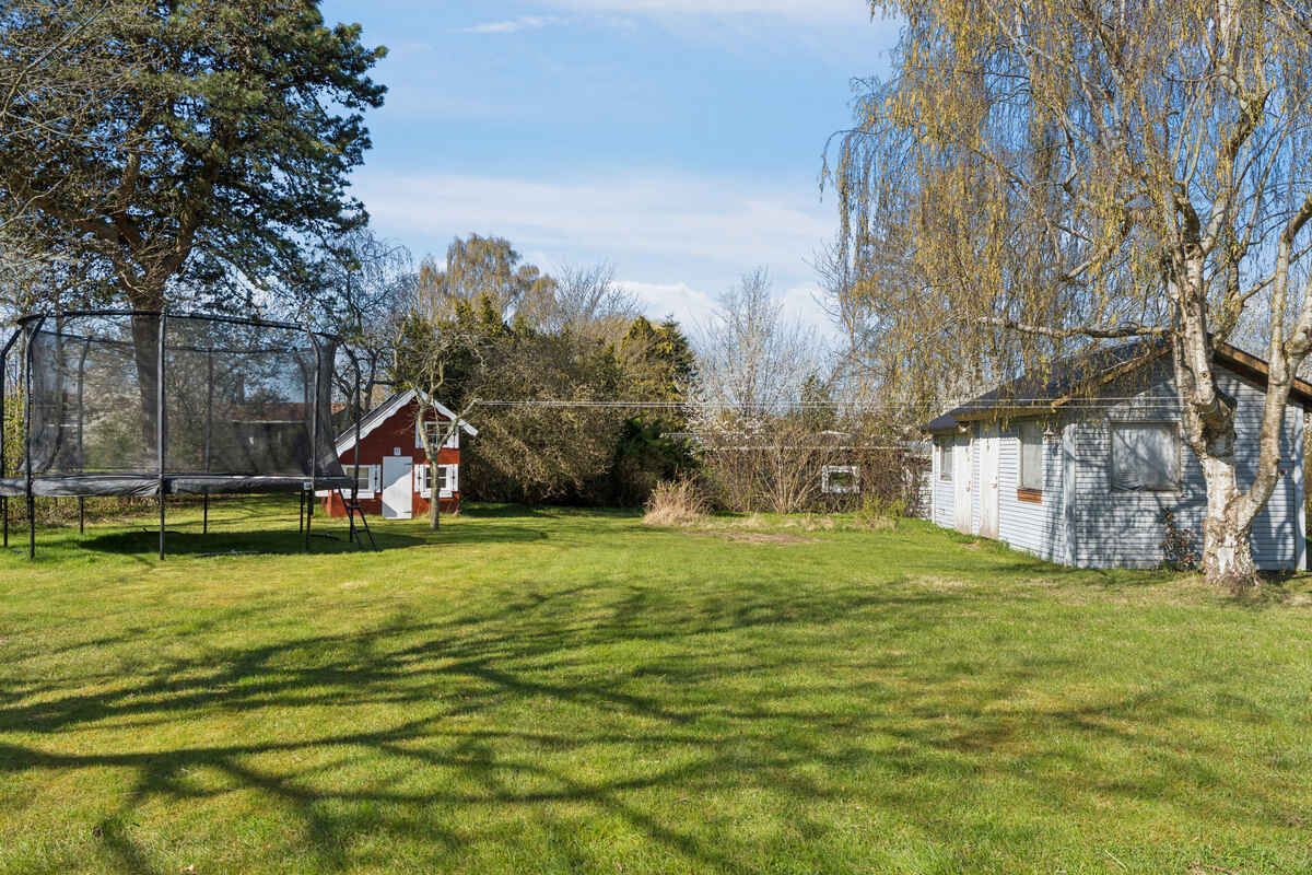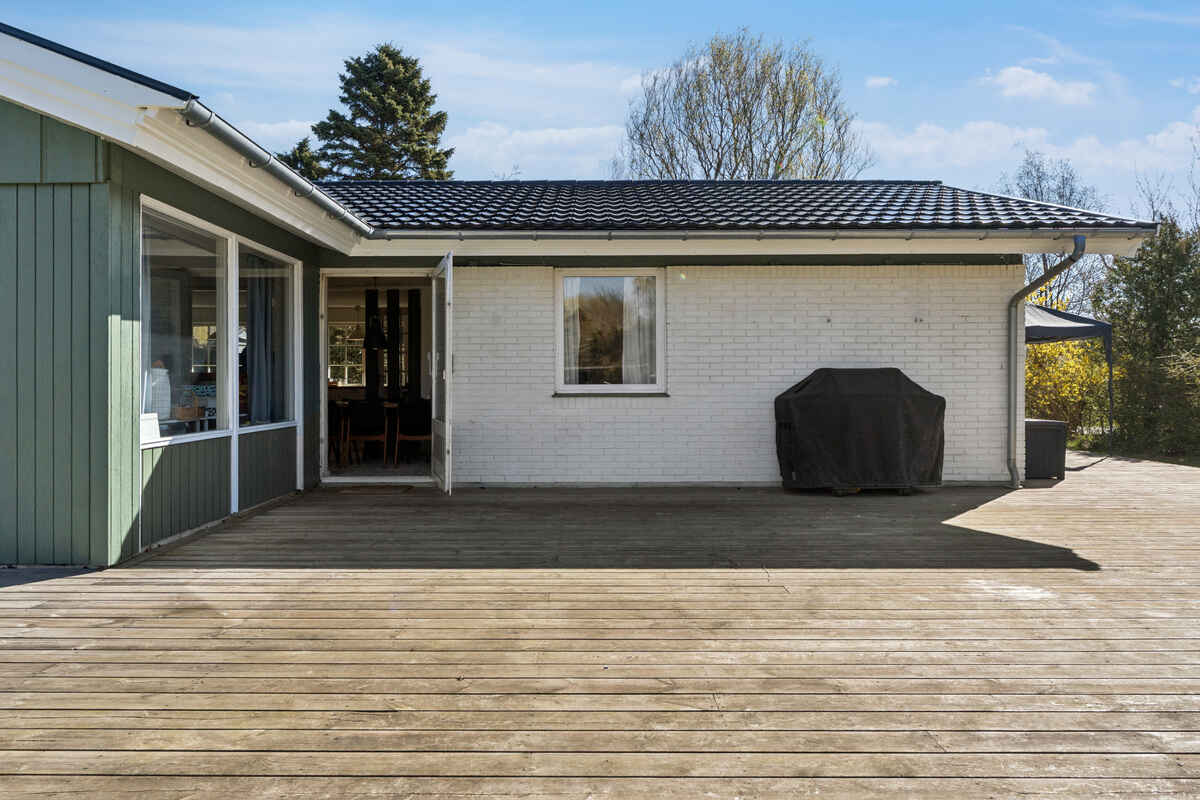 Udendørs finder du en stor terrasse og en dejlig have, hvor både børn og voksne kan hygge sig. Haven byder på trampolin, legehus, stangtennis og masser af andre havespil – ideelt til lange sommerdage med leg og afslapning.