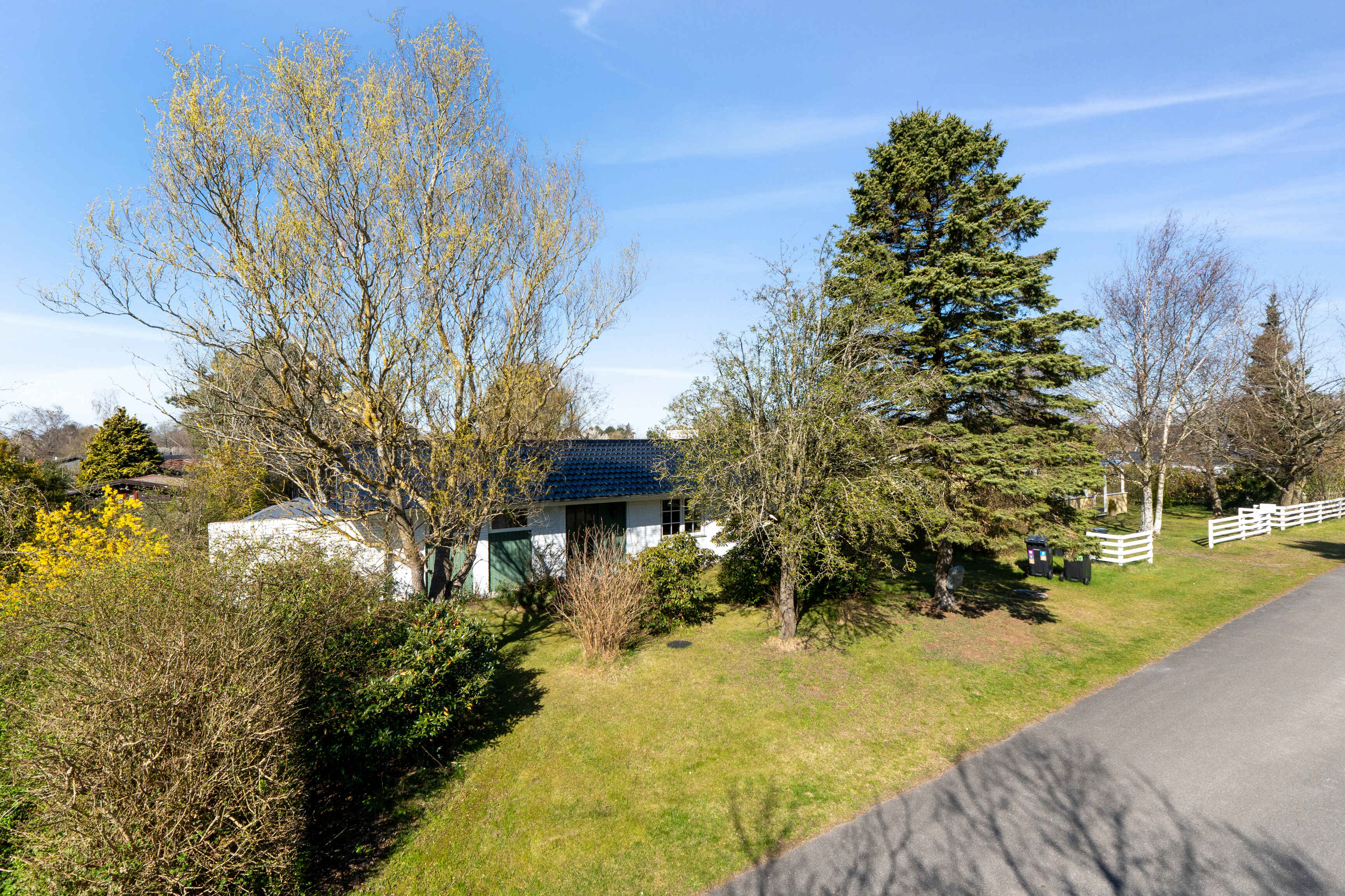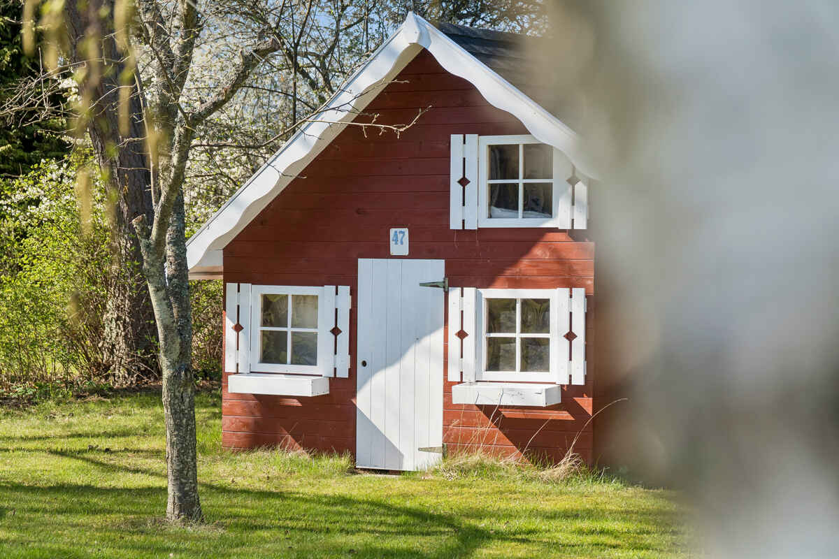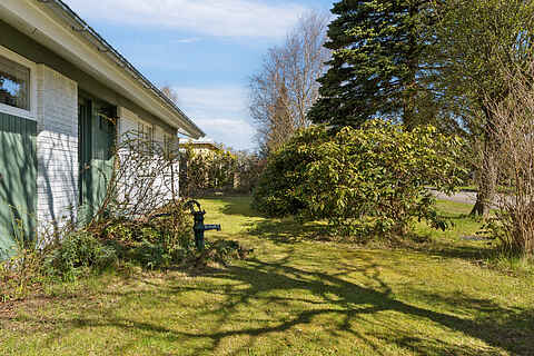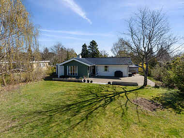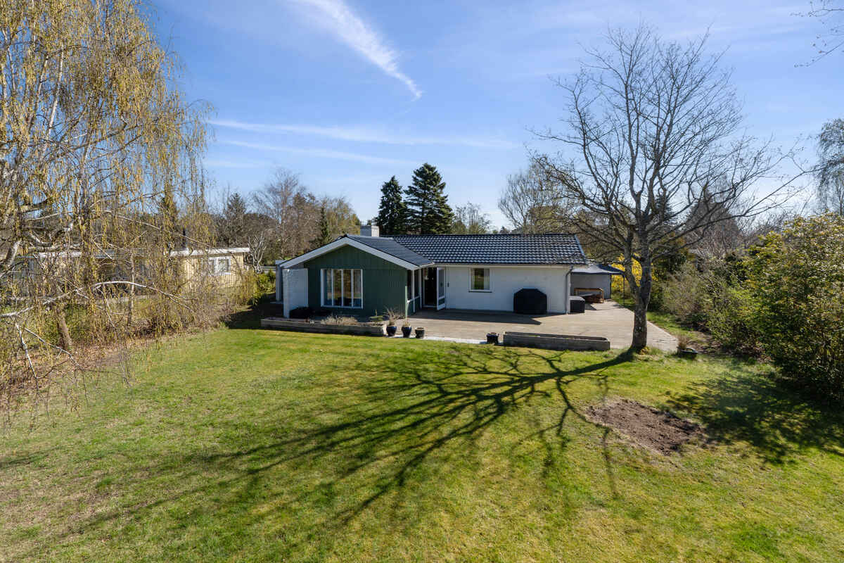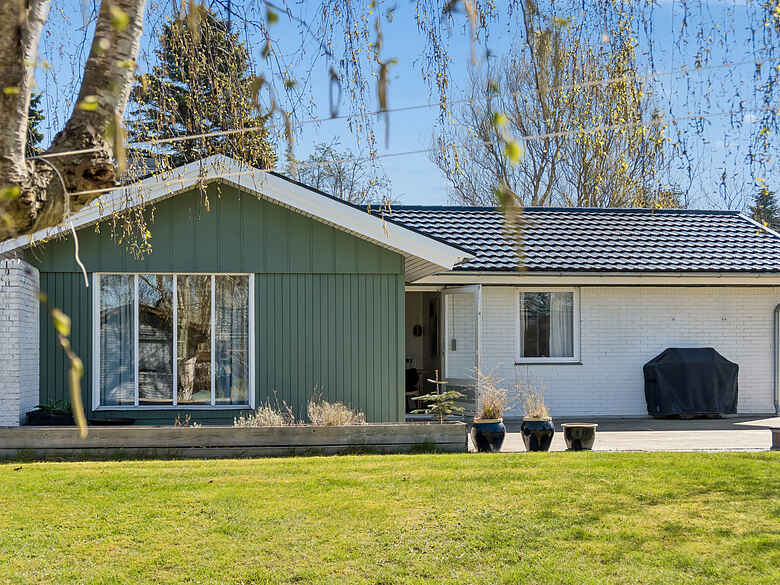 Udendørs finder du en stor terrasse og en dejlig have, hvor både børn og voksne kan hygge sig. Haven byder på trampolin, legehus, stangtennis og masser af andre havespil – ideelt til lange sommerdage med leg og afslapning.