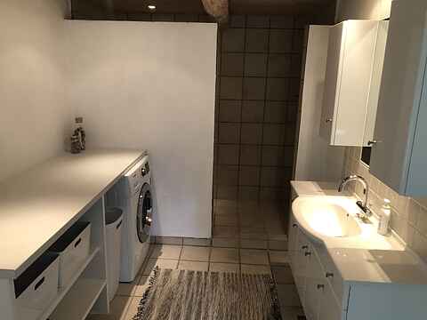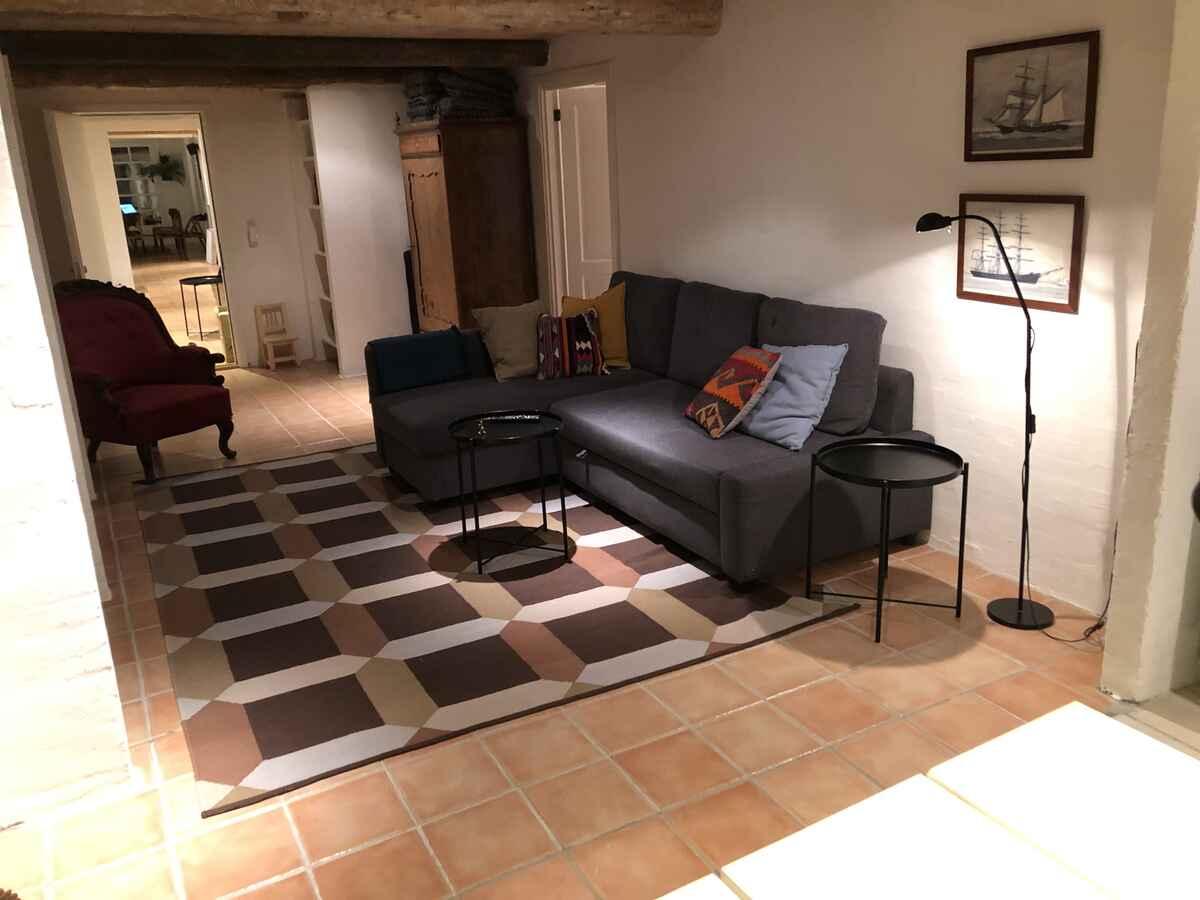 Stuen ligger i sammenhæng med fuldt udstyret køkken og spisestue. Herfra går man ud på den nordvendte terrasse hvor der er udsigt over vandet. Fra køkkenet er der ligeledes adgang til badeværelset der indeholder brus og vaskemaskine.