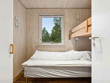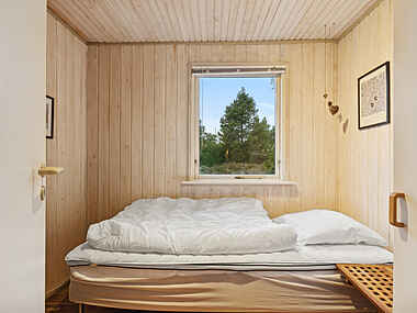 Indenfor ligger køkken, spiseplads og stue i ét sammenhængende rum. Her findes en brændeovn, som skaber en behagelig stemning på kølige dage. Huset har tre soveværelser fordelt på et med dobbeltseng, et med enkeltseng og et med køjeseng.