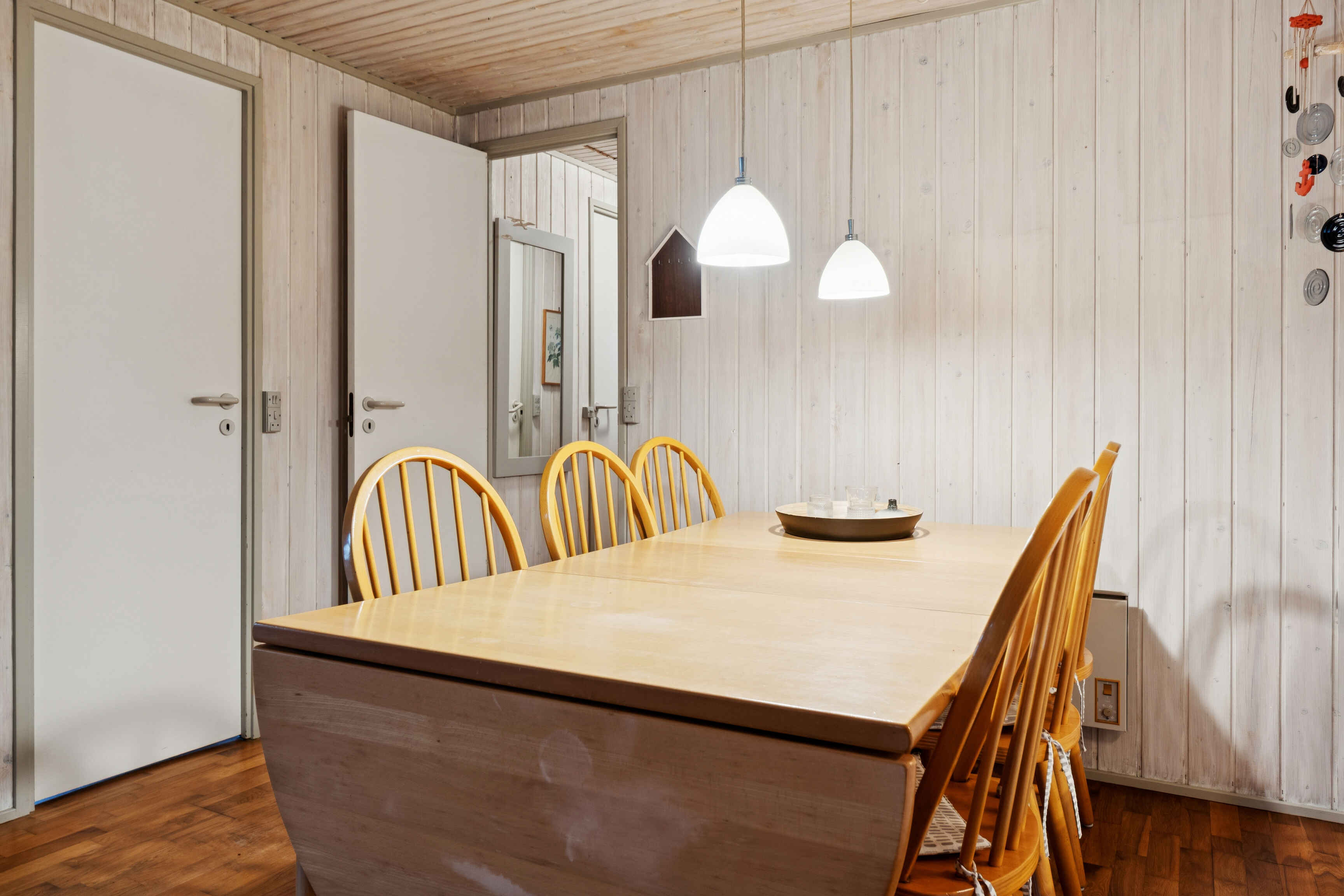 Indenfor ligger køkken, spiseplads og stue i ét sammenhængende rum. Her findes en brændeovn, som skaber en behagelig stemning på kølige dage. Huset har tre soveværelser fordelt på et med dobbeltseng, et med enkeltseng og et med køjeseng.