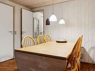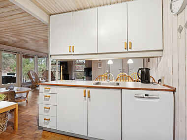 Det 64 m² store sommerhus rummer plads til fem personer og er indrettet til et ophold, hvor ro og nærhed til naturen er i centrum. Den åbne planløsning giver en afslappet atmosfære og gør det let at være samlet, uanset om dagen foregår ude eller inde.